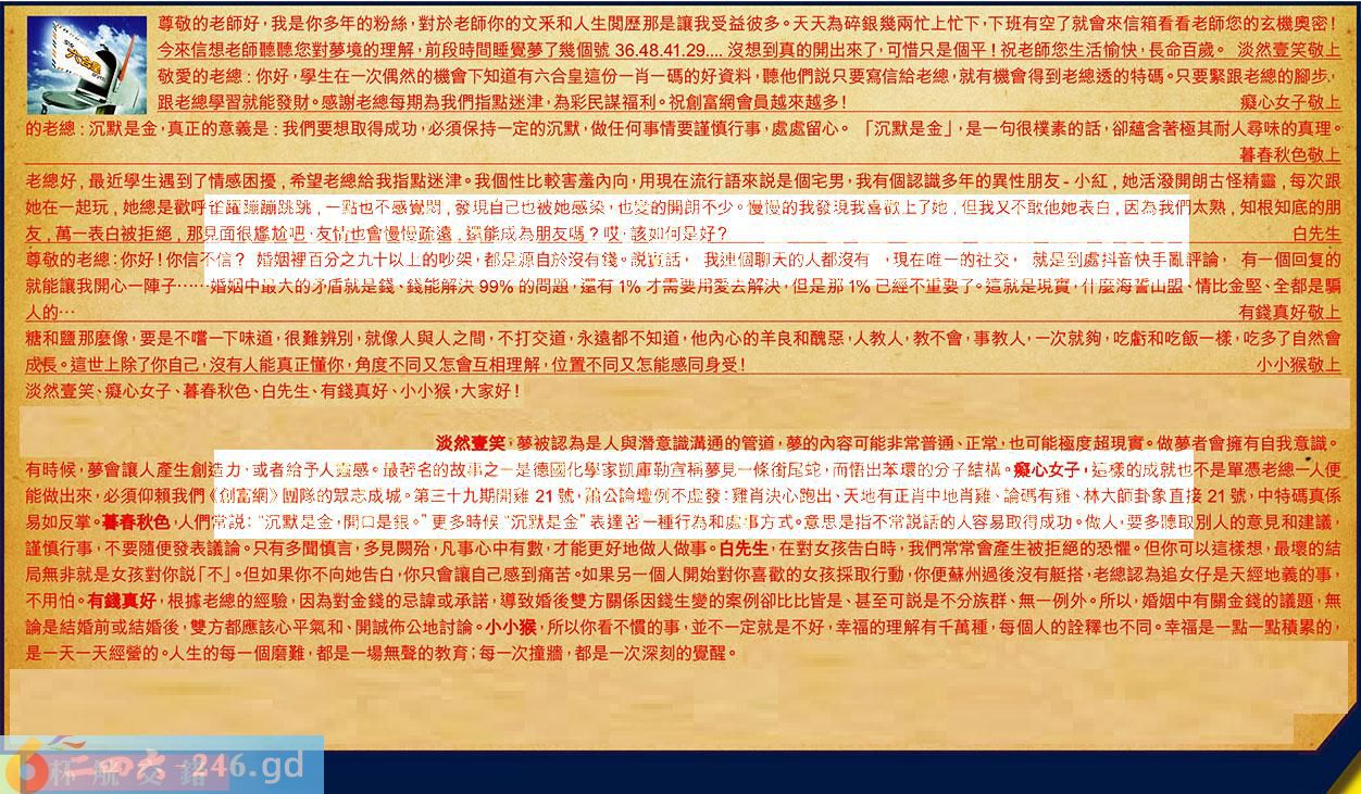第044期《六合皇信箱文字版》10000%正確!!!正版二四六論壇*精心製作!!! 淡然壹笑、癡心女子、暮春秋色、白先生、有錢真好、小小猴,大家好! 【1】.尊敬的老師好,我是你多年的粉絲,對於老師你的文采和人生閱歷那是讓我受益彼多。天天為碎銀幾兩忙上忙下,下班有空了就會來信箱看看老師您的玄機奧密!今來信想老師聽聽您對夢境的理解,前段時間睡覺夢了幾個號36.48.41.29....沒想到真的開出來了,可惜只是個平!祝老師您生活愉快,長命百歲。淡然壹笑敬上 〖淡然壹笑〗:萝被認為是人與潛意識溝通的管道,夢的內容可能非常普通、正常,也可能極度超現實。做夢者會擁有自我意識。有時候,夢會讓人產生創造力,或者給予人靈感。最著名的故事之一是德國化學家凱庫勒宣稱夢見一條銜尾蛇,而悟出苯環的分子結構。 【2】.敬愛的老總:你好,學生在一次偶然的機會下知道有六合皇這份一肖一碼的好資料,聽他們說只要寫信給老總,就有機會得到老總透的特碼。只要緊跟老總的腳步,跟老總學習就能發財。感謝老總每期為我們指點迷津,為彩民謀福利。祝創富網會員越來越多!癡心女子敬上 〖癡心女子〗:這樣的成就也不是單憑老總一人便能做出來,必须仰賴我們《創富網》團隊的眾志成城。第三十九期開雞21號,蕭公論壇例不虚發:雞肖決心跑出、天地有正肖中地肖雞、論碼有雞、林大師卦象直接21號,中特碼真係易如反掌。 【3】.的老總:沉默是金,真正的意義是:我們要想取得成功,必須保持一定的沉默,做任何事情要謹慎行事,處處留心。「沉默是金」,是一句很樸素的話,卻蘊含著極其耐人尋味的真理。暮春秋色敬上 〖暮春秋色〗:人們常說:“沉默是金,開口是銀。”更多時候“沉默是金”表達著一種行為和處事方式。意思是指不常說話的人容易取得成功。做人,要多聽取别人的意見和建議,謹慎行事,不要隨便發表議論。只有多聞慎言,多見闕殆,凡事心中有數,才能更好地做人做事。 【4】.老總好,最近學生遇到了情感困擾,希望老總給我指點迷津。我個性比較害羞內向,用現在流行語來說是個宅男,我有個認識多年的異性朋友-小紅,她活潑開朗古怪精靈,每次跟她在一起玩,她總是歡呼雀躍蹦蹦跳跳,一點也不感覺悶,發現自己也被她感染,也變的開朗不少。慢慢的我發現我喜歡上了她,但我又不敢他她表白,因為我們太熟,知根知底的朋友,萬一表白被拒絕,那見面很檻尬吧,友情也會慢慢疏遠,還能成為朋友嗎?哎,該如何是好?白先生 〖白先生〗:在對女孩告白時,我們常常會產生被拒絕的恐懼。但你可以這樣想,最壞的結局無非就是女孩對你說「不」。但如果你不向她告白,你只會讓自己感到痛苦。如果另一個人開始對你喜歡的女孩採取行動,你便蘇州過後沒有艇搭,老總認為追女仔是天經地義的事,不用怕。 【5】.尊敬的老總:你好!你信不信?婚姻裡百分之九十以上的吵架,都是源自於沒有錢。說寶話”我連個聊天的人都沒有,現在唯一的社交,就是到處抖音快手亂評論,有一個回复的就能讓我開心一陣子......婚姻中最大的矛盾就是錢、錢能解決99%的問題,還有1%才需要用愛去解決,但是那1%已經不重要了。這就是現實,什麼海誓山盟、情比金堅、全都是騙人的...有錢真好敬上 〖有錢真好〗:根據老總的經驗,因為對金錢的忌諱或承諾,導致婚後雙方關係因錢生變的案例卻比比皆是、甚至可說是不分族群、無一例外。所以,婚姻中有關金錢的議題,無論是結婚前或結婚後,雙方都應該心平氣和、開誠饰公地討論。 【6】.糖和鹽那麼像,要是不嚐一下味道,很難辨別,就像人與人之間,不打交道,永遠都不知道,他內心的羊良和醜惡,人教人,教不會,事教人,一次就夠,吃虧和吃飯一樣,吃多了自然會成長。這世上除了你自己,沒有人能真正懂你,角度不同又怎會互相理解,位置不同又怎能感同身受!小小猴敬上 〖小小猴〗:所以你看不慣的事,並不一定就是不好,幸福的理解有千萬種,每個人的詮釋也不同。幸福是一點一點積累的,是一天一天經營的。人生的每一個磨難,都是一場無聲的教育;每一次撞牆,都是一次深刻的覺醒。 紅字:杯觥交錯 暗码:01254145 [释义]比喻相聚饮酒时的欢乐。觥,酒器。 [出处]宋·欧阳修《醉翁亭记》:“射者中,弈者胜,觥筹交错,坐起而喧哗者,众宾欢也。”