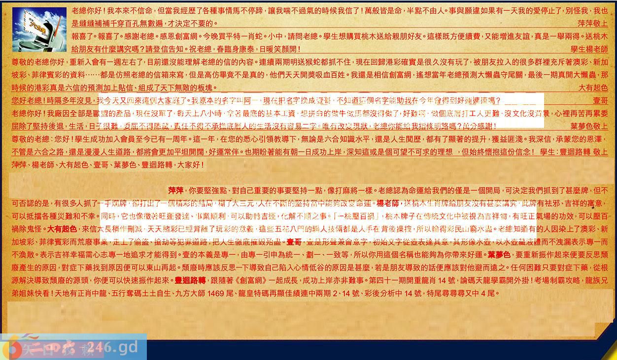 第047期《六合皇信箱文字版》10000%正確!!!正版二四六論壇*精心製作!!! 萍萍、楊老師、大有起色、壹哥、葉夢色、豐迴路轉,大家好! 【1】.老總你好!我本來不信命,但當我經歷了各種事情馬不停蹄,讓我喘不過氣的時候我信了!萬般皆是命,半點不由人。事與願違如果有一天我的愛停止了,别怪我,我也是縫縫補補千穿百孔無數遍,才決定不要的。萍萍敬上 〖萍萍〗:你要堅強點、對自己重要的事要堅持一點,像打麻將一樣。老總認為命運給我們的僅是一個開局,可決定我們抓到了甚麼牌,但不可否認的是,有很多人抓了一手爛牌,卻打出了一個精彩的結局,糊了大三元,人在不断的堅持當中能夠改變命運。 【2】.報喜了。報喜了。感謝老總。感恩創富網。今晚買平特一肖蛇。小中,請問老總。學生想購買桃木送給親朋好友。這樣既方便續費,又能增進友誼,真是一舉兩得。送桃木給朋友有什麼講究嗎?請登信告知。祝老總,春臨身康泰,日暖笑顏開!學生楊老師 〖楊老師〗:送桃木生肖牌給朋友沒有甚麼講究,此牌有祛邪、吉祥的寓意,可以抵擋各種災難和不幸。同時它也像徵著旺運發達、事業順利,可以助轉吉運,化解不順之事。「一桃壓百禍」桃木牌子在傳統文化中被視為吉祥物,有旺正氣場的功效,可以壓百禍除鬼怪。 【3】.尊敬的老總你好,重新入會有一週左右了,目前還沒能理解老總的信的內容。連續兩期明送猴蛇都抓不住,現在回歸港彩確實是很久沒有玩了,被朋友拉入的很多群裡充斥著澳彩、新加坡彩、菲律賓彩的資料......都是仿照老總的信箱來寫,但是高仿畢竟不是真的,他們天天開獎吸血百姓。我還是相信創富網,遙想當年老總預測大懶蟲守尾關,最後一期真開大懶蟲,那時候的港彩真是六信的預測加上貼信、組成了天下無敵的板塊。大有起色 〖大有起色〗:來信太長稍作刪減,天天賭彩已經背離了玩彩的意義,這些五花八門的騙人技倆都是人手在背後操控,所以輸得彩民山窮水盡。老總知道有的人因染上了澳彩、新加坡彩、菲律寶彩而荒廢事業,走上了偷盜、搶劫等犯罪道路;把人生徹底摧毁殆盡。 【4】.您好老總!時隔多年沒見我今天又回來這個大家庭了。我原本的名字叫阿一,現在把名字换成壹哥,不知道這個名字能助我在今年會得到好運連連嗎?壹哥 〖壹哥〗:壹是形聲兼會意字,初始文字從壶表達其意,其形像水壺,以水壺藏液體而不浅漏表示專一而不渙散。表示吉祥幸福需心志專一地追求才能得到。壹的本義是專一,由專一引申為統一、劃一、一致等,所以你用這個名稱也能夠為你帶來好運。 【5】.老總你好!我廠因全部是歐盟的產品現在沒單了,每天上八小時,拿著最底的基本工资,想拼命的做牛做馬都没得做了,好難啊,做個底層打工人更難,沒文化沒背景,心裡再苦再累委屈除了堅持後退,生活,日子很難,委屈不得隱藏,责任不得不承擔底層人的生活沒有容易字。唯有改變現狀,老總你能給我指條明路嗎?萬分感謝!葉夢色敬上 〖葉夢色〗:要重新振作起來便要反思頹廢產生的原因,對症下藥找到原因便可以東山再起。頹廢時應該反思一下導致自己陷入心情低谷的原因是甚麼,若是朋友導致的話便應該對他避而遠之。任何困難只要對症下藥,從根源解決導致頹廢的源頭,你便可以快速振作起來。 【6】.尊敬的老總:您好!學生成功加入會員至今已有一周年。這一年,在您的悉心引領教導下,無論是六合知識水平,還是人生閱歷,都有了顯著的提升,獲益匪淺。我深信,承蒙您的恩澤,不管是六合之路,還是漫漫人生道路,都將會更加平坦開闊,好運常伴。也期盼著能有朝一日成功上岸,深知這或是個可望不可求的理想,但始終懷抱這份信念!學生:豐迴路轉敬上 〖豐迴路轉〗:跟隨著《創富網》一起成長,成功上岸亦非難事。第四十-期開重龍肖14號,論碼天龍學霸開外掛!考場制霸攻略,龍族兄弟姐妹快看!天地有正肖中龍、五行奪碼土土自生、九方大師1469尾、龍皇特碼再顯佳績連中兩期2、14號、彩後分析中14號,特尾尋尋尋又中4尾。 紅字:矢口狡賴 暗码:08124148 [释义]死也不肯承认。