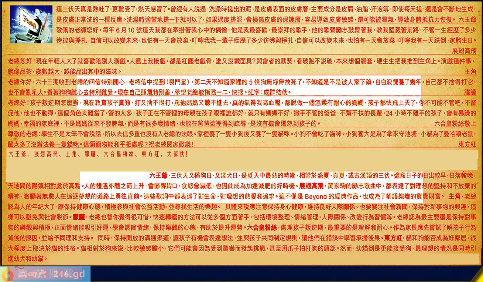 第071期《六合皇信箱文字版》10000%正確!!!正版二四六論壇*精心製作!!! 六王爺、展翅高飛、主角、朦朧、六合皇粉絲、東方紅,大傢伙! 【1】.這三伏天真是熱吐了,更難受了熱天感冒了。曾經有人說過洗澡時搓出的泥,是皮膚表面的皮膚層,主要成分是皮屑油脂汗液等,即使每天搓還是會不斷地生成,是皮膚正常洗的一種反應。洗澡時適當地搓一下就可以了,如果過度搓泥,會損傷皮膚的保護層,容易導致皮膚敏感,還可能被濕氣,導致身體抵抗力恢復。六王爺 〖六王爺〗:三伏天又稱狗日。又譯犬日,是夏天中最熱的時期,相當於盛夏、真夏,或古漢語的三伏。這段日子的日出較早、日落較晚,天地間的陽氣相對處於高點。人的體溫亦隨之而上升,會影響胃口,食慾會減低,也因此成為加速減肥的好時機。 【2】.敬佩的老師您好,每年6月10號這天我都在牽掛著我心中的偶像,他是我最喜歡、最崇拜的歌手,他的歌聲勵志鼓舞著我,教我堅毅著前路,不管一生經歷了多少镑徨與掙扎自信可以改變未來,也怕有一天會放棄,叮嚀我我一輩子經歷了多少彷佛與掙扎,自信可以改變未來,也怕有一天會放棄叮嚀我有一天跌倒,家駒生日。展翅高飛 〖展翅高飛〗:黄家駒的勵志歌曲中,都表達了對理想的堅持和不放棄的精神,激勵著無數人在追逐萝想的道路上勇往直前。這些歌詞中都表達了對生命、對理想的熱愛和追求。這不僅是的經典作品,也成為了華語樂壇的寶貴財富。 【3】.老總您好!現在年輕人大了就喜歡陪別人演戲。人遞上我接戲,都是紅慶老戲骨,誰又沒戴面具?與會者的默契,看破跑不說破,本來想個龍套,硬生生把我推到主角上。演戲這件事,就像品茶,歲數越大,越能品出其中的滋味。主角 〖主角〗:老總認為人的年紀大了,應保持健康心態,積極參與社會公益活動,並尋找生活的樂趣。具體來說應注意保持身心健康,維持良好人際關係。也要關注社會新聞,保持對新事物的興趣,這樣可以避免與社會脱節。 【4】.老總你好,六十三期收到老總的回信特別開心,老總信中提到(喪門星),第二天不知道家裡的5條狗無緣無故死了,不知道是不是被人家下藥,白白浪費養了幾年,自己都不捨得打它,也不會亂吼人。看著狗狗離心去特別難受。現在自己運氣特別差,希望老總能指點一二,快搜。紅字:成群结伙。朦朧 〖朦朧〗:老總也替你覺得很可惜,快速轉運的方法可以從多個方面著手,包括環境整理、情緒管理、人際關係、改變行為習慣等。老總認為最主要還是保持對事物的樂觀與積極,正面情緒能吸引好運,學會調節情緒,保持樂觀的心態,有助於提升運勢。 【5】.老總好!孩子叛逆期怎麼辦,現在教育孩子真難,打又捨不得打,罵他媽媽又聽不進去,真的氣得我高血壓,都說做一個溫柔有耐心的媽媽,孩子都快飛上天了,你不可能不管吧,不督促他,他也不動彈,這個角色太難當了,管的太多,孩子正在不管裡的母親在孩子眼裡誰都好,就只有媽媽不好,撒手不管的爸爸,不幫不扶的長輩,24小時不離手的孩子,會有暴躁的媽媽,幸福的家庭裡,不是媽媽從來不發脾氣,而是有很多壞情緒,也能在爸爸這裡得到疏導,是沒有機會遷怒到孩子的。六合皇粉絲敬上 〖六合皇粉絲〗:處理孩子叛逆期,最重要的是理解和耐心。作為家長應先嘗試了解孩子行為背後的原因,並給予同理和支持。同時,保持開放的溝通渠道,讓孩子有機會表達想法,並與孩子共同制定規則,讓他們在錯誤中學習承擔後果。 【6】.尊敬的老總:學生不是太笨不會說話,所以去信多重也沒有入老總的法眼。家裡養了一隻小狗後又養了一隻貓咪。小狗不會吃了貓咪。小狗養大是為了拿來守池塘,小貓為了曼哈頓老鼠,鼠太多了沒辦法養一售貓咪。這倆寵物能和平相處呢?祝老總閔家歡樂!東方紅 〖東方紅〗:貓和狗能否成為好鄰居,很大程度上取決於貓的性格。貓相對於狗來說,比較敏感膽小,它們可能會因為受到驚嚇而發起挑戰,甚至用爪子拍打狗的頭部。然而,幼貓倒是更能接受狗,最理想的情況是同時引進幼犬和幼貓。 紅字:鉤玄獵祕 暗码:01213849 [释义]探取精微,搜寻奥秘。 [出处]清·陈田《明诗纪事戊签·江晖》:“景孚为文,钩玄猎秘,杂以古文奇字。”