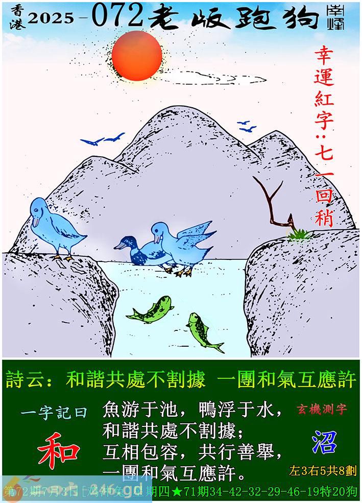 072期老版跑狗一字記之曰:【和】 詩雲:和諧共處不割據,一團和氣互應許。 魚游于池,鴨浮于水,和諧共處不割據; 互相包容,共行善舉,一團和氣互應許。 玄機測字:《沼》