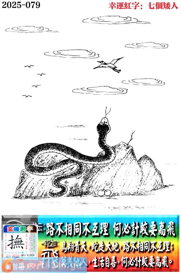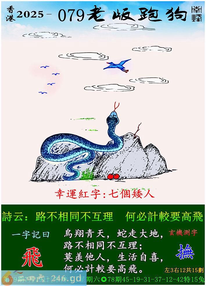 079期老版跑狗一字記之曰:【飛】 詩雲:路不相同不互理,何必計較要高飛。 鳥翔青天,蛇走大地,路不相同不互理; 莫羨他人,生活自喜,何必計較要高飛。 玄機測字:《撫》