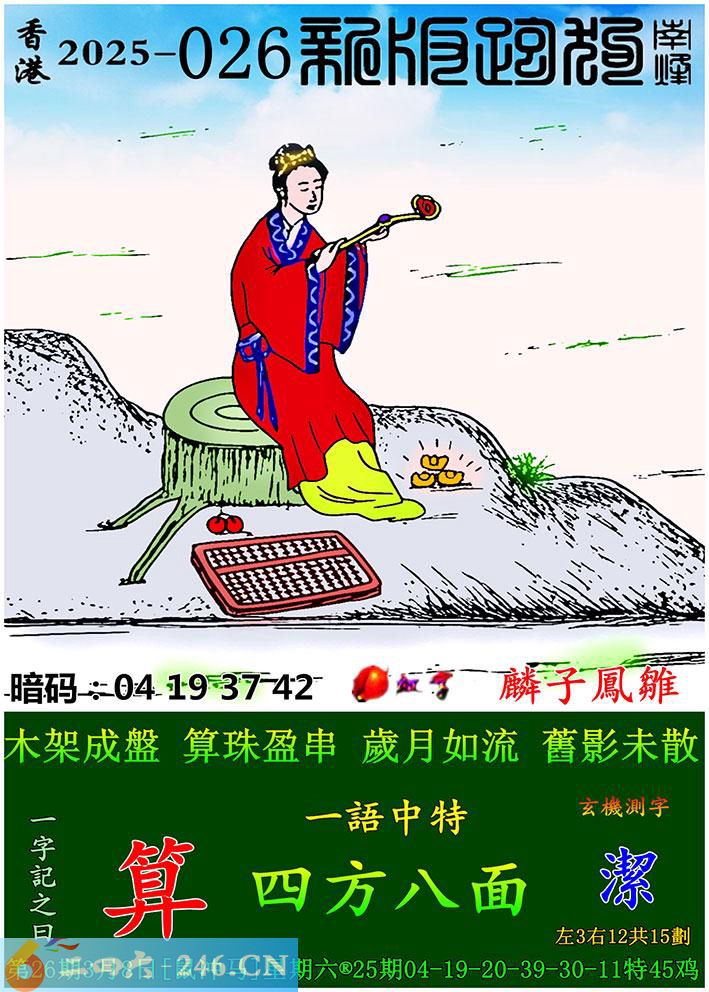 026期跑狗一字記之曰:【算】 木架成盤,算珠盈串。 歲月如流,舊影未散。 玄機測字:《潔》 一語中特:四方八面