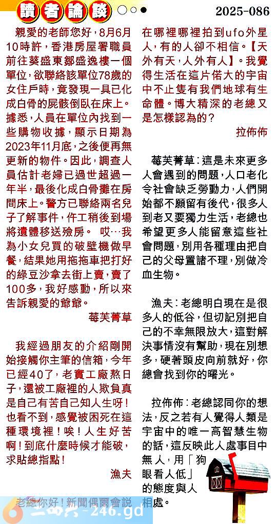 第零八六期讀者論談 1.親愛的老師您好,8月6月10時許,香港房屋署職員前往葵盛東鄒盛逸樓一個單位,欲聯絡該單位78歲的女住戶時,竟發現一具已化成白骨的屍骸倒臥在床上。據悉,人員在單位內找到些購物收據,顯示日期為2023年11月底,之後便再無更新的物件。因此,調查人員估計老婦已過世超過年半,最後化成白骨攤在房間床上。警方已聯絡兩名兒子了解事件,许工稍後到場將遗體移送殮房。哎...我為小女兒買的破壁機做早餐,結果她用拖拖車把打好的緣豆沙拿去街上賣,賣了100多,我好感動,所以來告訴親愛的爺爺。莓芙菁草 〖莓芙菁草〗:這是未來更多人會遇到的問題,人口老化令社會缺乏勞動力,人們開始都不願留有後代很多人到老又要獨力生活,老總也希望更多人能留意這些社會問題,別用各種理由把自己的父母置諸不理,別做冷血生物。 2.我經過朋友的介紹剛開始接觸你主筆的信箱,今年已經40了,老實工廠熬日子,還被工廠裡的人欺負真是自己有苦自己知人生呀!也看不到,感覺被困死在這種環境裡!唉!人生好苦啊!到底什麼時候才能破,求貼總指點!漁夫 〖漁夫〗:老總明白現在是很多人的低谷,但切記別把自己的不幸無限放大,這對解決事情沒有幫助,現在別想多,硬著頭皮向前就好,你總會找到你的曙光。 3.老總你好!新聞偶爾會說在哪裡哪裡拍到外星人,有的人卻不相信。[天外有天,人外有人]。我覺得生活在這片偌大的宇宙中不止隻有我們地球有生命體。博大精深的老總又是怎樣認為的?拉饰饰 〖拉饰饰〗:老總認同你的想法,反之若有人覺得人類是宇宙中的唯一高智慧生物的話,這反映此人處事目中無人,用「狗眼看人低」的態度與人相處。