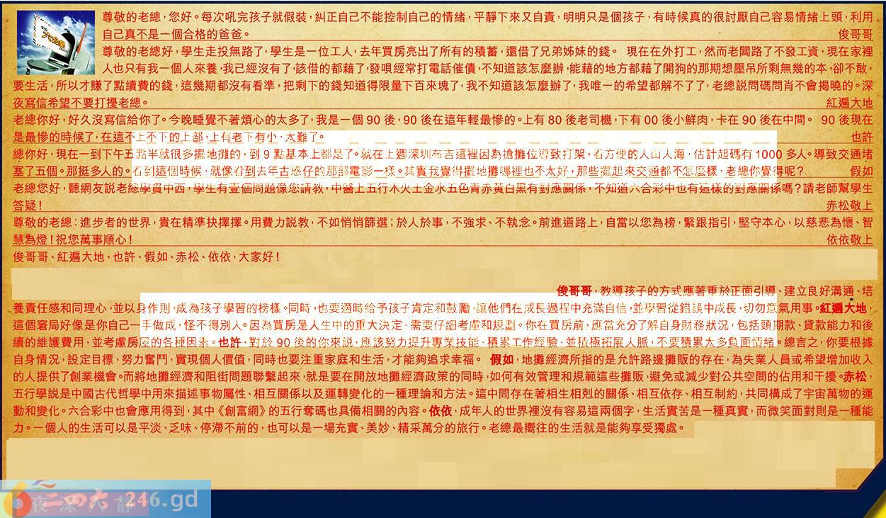 第086期《六合皇信箱文字版》10000%正確!!!正版二四六論壇*精心製作!!! 俊哥哥、紅遍大地、也許、假如、赤松、依依,大家好! 【1】.尊敬的老總,您好。每次吼完孩子就假装,糾正自己不能控制自己的情緒,平靜下來又自責,明明只是個孩子,有時候真的很討厭自己容易情緒上頭,利用自己真不是一個合格的爸爸。俊哥哥 〖俊哥哥〗:教導孩子的方式應著重於正面引導、建立良好溝通、培養責任感和同理心,並以身作則,成為孩子學習的榜樣同時,也要適時給予孩子肯定和鼓勵,讓他們在成長過程中充滿自信,並學習從錯誤中成長切勿意氣用事。 【2】.尊敬的老總好,學生走投無路了,學生是一位工人,去年買房亮出了所有的積蓄,還借了兄弟姊妹的錢。現在在外打工,然而老闆路了不發工资,現在家裡人也只有我一個人來養,我已經沒有了,該借的都藉了,發唄經常打電話催債,不知道該怎麼辦,能藉的地方都藉了開狗的那期想壓吊所剩無幾的本,卻不敢,要生活,所以才賺了點續費的錢,這幾期都沒有看準,把剩下的錢知道得限量下百來塊了,我不知道該怎麼辦了,我唯一的希望都解不了了,老總說問碼問肖不會揭曉的。深夜寫信希望不要打擾老總。紅遍大地 〖紅遍大地〗:這個窘局好像是你自己一手做成,怪不得別人。因為買房是人生中的重大決定,需要仔細考慮和規劃。你在買房前,應當充分了解自身財務狀況,包括頭期款、貸款能力和後續的維護费用,並考慮房屋的各種因素。 【3】.老總你好,好久沒寫信給你了。今晚睡覺不著煩心的太多了,我是一個90後,90後在這年輕最慘的。上有80後老司機,下有00後小鮮肉,卡在90後在中間。90後現在是最惨的時候了,在這不上不下的上部,上有老下有小,太難了。也許 〖也許〗:對於90後的你來說,應該努力提升專業技能、積累工作經驗、並積極拓展人脈,不要積累太多負面情緒。總言之,你要根據自身情況,設定目標,努力奮鬥,實現個人價值,同時也要注重家庭和生活,才能夠追求幸福。 【4】.總你好,現在一到下午五點半就很多擺地攤的,到9點基本上都是了。就在上遇深圳布吉這裡因為搶攤位導致打架,看方便的人山人海,估計起碼有1000多人。導致交通堵塞了五個。那挺多人的。看到這個時候,就像看到去年古惑仔的那部電影一樣。其實我覺得擺地攤哪裡也不太好,那些擺起來交通都不怎麼樣,老總你覺得呢?假如 〖假如〗:地攤經濟所指的是允許路邊攤販的存在,為失業人員或希望增加收入的人提供了創業機會。而將地攤經濟和阻街問題聯繫起來,就是要在開放地攤經濟政策的同時,如何有效管理和規範這些攤販,避免或減少對公共空間的佔用和干擾。 【5】.老總您好,聽網友說老總學貫中西,學生有壹個問題像您請教,中醫上五行木火土金水五色青赤黄白黑有對應關係,不知道六合彩中也有這樣的對應關係嗎?請老師幫學生答疑!赤松敬上 〖赤松〗:五行學說是中國古代哲學中用來描述事物屬性、相互關係以及運轉變化的一種理論和方法。這中間存在著相生相刺的關係、相互依存、相互制約,共同構成了宇宙萬物的運動和變化。六合彩中也會應用得到,其中《創富網》的五行奪碼也具備相關的內容。 【6】.尊敬的老總:進步者的世界,貴在精準抉擇擇。用费力說教,不如悄悄篩選;於人於事,不強求、不執念。前進道路上,自當以您為榜,緊跟指引,堅守本心,以慈悲為懷、智慧為燈!祝您萬事順心!依依敬上 〖依依〗:成年人的世界裡沒有容易這兩個字,生活實苦是一種真實,而微笑面對則是一種能力。一個人的生活可以是平淡、乏味、停滯不前的,也可以是一場充實、美妙、精采萬分的旅行。老總最響往的生活就是能夠享受獨處。 紅字:夜深人靜 暗码:07134348 [释义]深夜没有人声,非常寂静。 [出处]汉·蔡琰《胡茄十八折》:“更深夜阑兮,梦汝来期。”