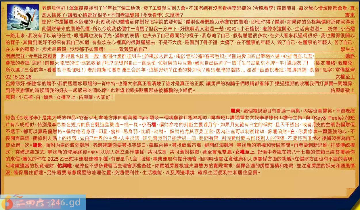 第091期《六合皇信箱文字版》10000%正確!!!正版二四六論壇*精心製作!!! 震東、小石榴、白、鑰匙、女權至上、佑與唯,大家好! 【1】.老總見信好!渾渾摸摸找到了半年找了個工地活,發了工資就立刻入會。不知老總有沒有看過李思捷的(今晚看李)這個節目,每次我心情煩悶都會看,真是太搞笑了,讓我心情都好很多。不知老總覺得(今晚看李)怎麼樣?震東 〖震東〗:這個電視節目有看過一兩集,內容也真攪笑。不過老總認為《今晚睇李》是集大成的作品,它至少七處地方跟四個美國騷及一個趣劇節目極為相似,開場短片講述單立文找李思捷出山擔任主持,與《&》的短片有八成相似,特別是李思捷在短片的長白髮造型簡直一模一樣。 【2】.總好:你是懂風水命理的,此刻我深切體會到你對好名字說的那句話:偏財也老聽能力承擔它的風險,即使你得了偏財,如果你的命格無偏財那你就得另此偏財帶來的風險代價,所以今晚我估價中一肖馬了但我一分未下。好險啊我又避過一劫,哈哈。小石榴祝:老總永遠開心,生活美滋滋。粉絲:小石榴 〖小石榴〗:偏財命格的判斷主要看月令,如果月友藏有日主的偏財,且天干透出,或者月支的主氣為偏財但不透干,都可以算是偏財格偏財格喜身旺、印星、食神、忌身弱、比盾、劫財。偏財格尤其喜見正官,因為正官可以制衡比劫,保護偏財。 【3】.一路走來,我沒有了以前的任性,眼裡再也沒有了光,滿臉的表情,也失去了自己最開始的樣子,我忽略了自己,假裝邁過很多坎,在外人看來我過得很好,我也顯得很開心的樣子,其實到底好不好只有我自己知道,有些坎在心裡真的很難邁過去,不是不大度,是傷到了骨子裡,太痛了,在不懂事的年輕人,毀了自己,在懂事的年輕人,苦了自己在人生的道路上,步步是遺憾,步步都不如意啊!致狼狽的自己!學生白 〖白〗:你要修煉一顆堅強的心,不畏閒言惡語,撕掉別人貼上的標籤,做自己世界的主角。人生很短,短到讓我們只能活過一回,時間有限,別浪費時間去實踐別人的期望,不要等到最終才後悔沒有為自己綻放過一次。 【4】.老總您好,今年出來創業,但運氣也比較一般,每個行業都註明卷,如果加入進去由於忠實的顧客被爭取,可能最後面臨已倒閉收場,心裡有些忐不。鑰匙 〖鑰匙〗:面對內卷的激烈競爭,老總建議你要尋找突破口,擺脱內棬。尋找藍海市場,避開紅海競爭,尊找新的商機和發展空間。再者要創新思維,打破傳統模式:突破思維定式,尋找新的發展路徑。更可以與人建立合作關係,共同成長,共同應對挑戰,達至實現雙贏。 【5】.尊敬的老總:您好!前幾天發您的信應該收到了吧?您覺得自己一直很忙,忙著與會員互動,我就自己挑選了一個:「生肖靈氣桃木牌一羊」送朋友了!(朋友屬豬,我屬兔,所以選了三合的羊。看看能不能催旺)老總能幫忙看看運三合的羊,這樣好嗎?往後的勢如何?期待老總的指點...謝謝!最後祝老總::福壽綿綿,長命!紅字:常備整齊02152326女權至上 〖女權至上〗:記憶中老總在第八十七期的信箱已經答覆過你的來信,屬兔的你在2025乙巳蛇年運勢總體平穩,有吉星「八座」照耀,事業運勢有提升機會,但同時也需注意健康和人際關係方面的挑戰。在偏財方面也有不錯的表現,可考慮適當的投資理財。 【6】.呂總您好,感謝您的贈予,我們透過您恩賜的一肖中特。也讓大家真正看清楚了誰才是真正的正版。讓馬戶的狗腿子們眼睛都看綠了。透過這期的收穫我們打算買一間婚房,到時候辦酒的時候請我的好友一起過來吃酒吃席。也希望老總多點醒那些被驢騙的少婦們。佑與唯敬上 〖佑與唯〗:老總也不想多费唇舌去理會那些畜牲。你買婚房要根據夫妻雙方的實際需求,選擇合適的房屋面積和格局,並注意房屋的採光和通風情況,確保居住舒適。另外還要考慮房屋的地理位置、交通便利性、生活機能、以及周邊環境,確保生活便利性和居住品質。 紅字:綿裡藏針 暗码:04143444 [释义]形容柔中有刚。也比喻外貌和善,内心刻毒。 [出处]元·石君宝《曲江柳》第二折:“笑里刀剐皮割肉,绵里针剔髓挑筋。”