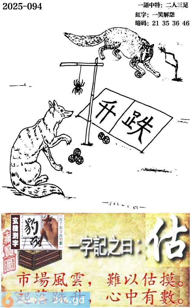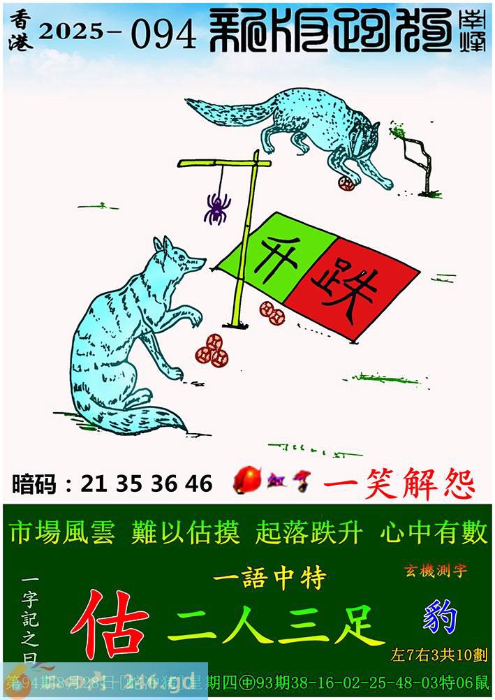 094期跑狗一字記之曰:【估】 市場風雲,難以估摸。 起落跌升,心中有數。 玄機測字:《豹》 一語中特:二人三足