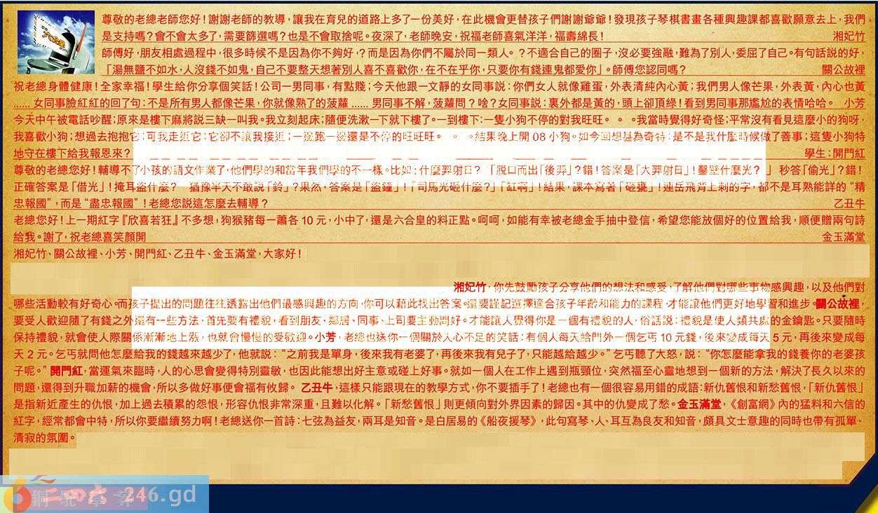 第096期《六合皇信箱文字版》10000%正確!!!正版二四六論壇*精心製作!!! 湘妃竹、關公故裡、小芳、開門紅、乙丑牛、金玉滿堂,大家好! 【1】.尊敬的老總老師您好!謝謝老師的教導,讓我在育兒的道路上多了一份美好,在此機會更替孩子們謝謝爺爺!發現孩子琴棋書畫各種興趣課都喜歡願意去上,我們是支持嗎?會不會太多了,需要篩選嗎?也是不會取捨呢。夜深了,老師晚安,祝福老師喜氣洋洋,福壽綿長!湘妃竹 〖湘妃竹〗:你先鼓勵孩子分享他們的想法和感受,了解他們對哪些事物感興趣,以及他們對哪些活動較有好奇心。而孩子提出的問題往往透露出他們最感興趣的方向,你可以藉此找出答案。還要謹記選擇適合孩子年龄和能力的課程,才能讓他們更好地學習和進步。 【2】.師傅好,朋友相處過程中,很多時候不是因為你不夠好'?而是因為你們不屬於同一類人。?不適合自己的圈子,沒必要強融,難為了别人,委屈了自己。有句話說的好,「湯無鹽不如水,人沒錢不如鬼,自己不要整天想著別人喜不喜歡你,在不在乎你,只要你有錢連鬼都愛你」。師傅您認同嗎?關公故裡 〖關公故裡〗:要受人歡迎随了有錢之外還有一些方法,首先要有禮貌,到朋友、鄰居同事、上司要主動問好。才能讓人覺得你是一個有禮貌的人,俗話説:禮貌是使人類共處的金鑰匙。只要随時保持禮貌,就會使人際關係漸漸地上漲,也就會慢慢的受歡迎。 【3】.祝老總身體健康!全家幸福!學生給你分享個笑話!公司一男同事,有點賤;今天他跟一文靜的女同事說:你們女人就像雞蛋,外表清純內心黃;我們男人像芒果,外表黄,內心也黃......女同事臉紅紅的回了句:不是所有男人都像芒果,你就像熟了的菠蘿......男同事不解,菠蘿問?啥?女同事說:裹外都是黄的,頭上卻頂綠!看到男同事那尷尬的表情哈哈。小芳 〖小芳〗:老總也送你一個關於人心不足的笑話:有個人每天給門外一個乞丐10元錢,後來變成每天5元,再後來變成每天2元。乞丐就問他怎麼給我的錢越來越少了,他就説:“之前我是單身,後來我有老婆了,再後來我有兒子了,只能越給越少。”乞丐聽了大怒,説:“你怎麼能拿我的錢養你的老婆孩子呢。” 【4】.今天中午被電話吵醒:原來是樓下麻將說三缺一叫我。我立刻起床;隨便洗漱一下就下樓了。一到樓下:一雙隻小狗不停的對我旺旺。。。我當時覺得好奇怪;平常沒有看見這麼小的狗呀,我喜歡小狗;想過去抱抱它;河我走近它;它卻不讓我接近;一邊跑一邊還是不停的旺旺旺。。。結果晚上開08小狗。如今回想甚為奇特是不是我什麼時候做了善事;這隻小狗特地守在樓下給我報恩來?學生:開門紅 〖開門紅〗:當運氣來臨時,人的心思會變得特別靈敏,也因此能想出好主意或碰上好事。就如一個人在工作上遇到瓶頸位,突然福至心靈地想到一個新的方法,解決了長久以來的問題,還得到升職加薪的機會所,以多做好事便會福有攸歸。 【5】.尊敬的老總您好!輔導不了小孩的語文作業了,他們學的和當年我們學的不一樣。比如什麼羿射日?脱口而出「後羿」?錯!答案是「大羿射日」鑿壁什麼光?」秒答「偷光」?錯!正確答案是「借光」!掩耳盗什麼?猶豫半天不敢說「鈴」?果然,答案是「盜鐘」!「司馬光砸什麼?」「缸啊」!結果,課本寫著「砸甕」!連岳飛背上刺的字,都不是耳熟能詳的“精忠報國”,而是“盡忠報國”!老總您說這怎麼去輔導?乙丑牛 〖乙丑牛〗:這樣只能跟現在的教學方式,你不要插手了!老總也有一個很容易用錯的成語:新仇舊恨和新愁舊恨,「新仇舊恨」是指新近產生的仇恨,加上過去積累的怨恨,形容仇恨非常深重,且難以化解。「新愁舊恨」則更傾向對外界因素的歸因。其中的仇變成了愁。 【6】.老總您好!上一期紅字「欣喜若狂」不多想,狗猴豬每一蕭各10元,小中了,還是六合皇的料正點。呵呵,如能有幸被老總金手抽中登信,希望您能放個好的位置給我,順便贈兩句詩給我。謝了,祝老總喜笑顏開金玉滿堂 〖金玉滿堂〗:《創富網》內的猛料和六信的紅字,經常都會中特,所以你要繼續努力啊!老總送你一首詩:七弦為益友,兩耳是知音。是白居易的《船夜援琴》,此句寫琴、人耳互為良友和知音,頗具文士意趣的同時也帶有孤單、清寂的氛圍。 紅字:銅駝草莽 暗码:11162243 [释义]形容国土沦陷后残破的景象。 [出处]《晋书·索靖传》:“靖有先识远量,知天下将乱,指洛阳宫门铜驼,叹曰:‘会见汝在荆棘中耳!’”