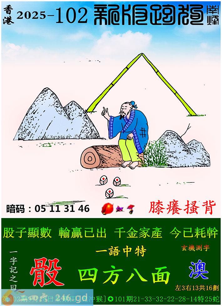 102期跑狗一字記之曰:【骰】 股子顯數,輸贏已出。 千金家產,今已耗幹。 玄機測字:《澳》 一語中特:四方八面