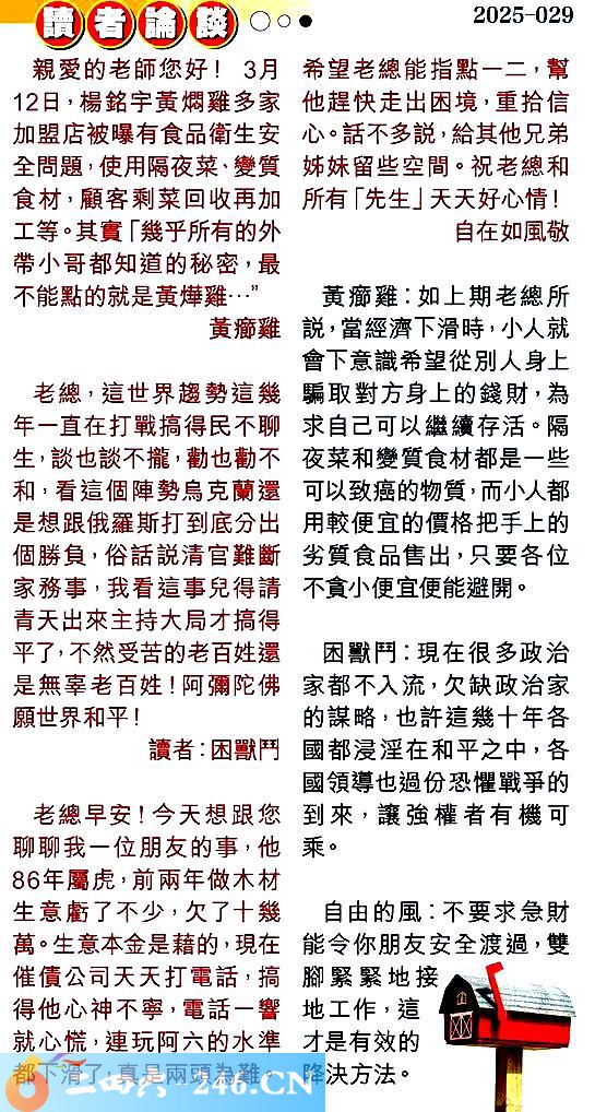 第零二九期讀者論談 1.親愛的老師您好!3月12日,楊銘宇黃燜雞多家加盟店被曝有食品衛生安全問題,使用隔夜菜、變質食材,顧客剩菜回收再加工等。其實「幾乎所有的外帶小哥都知道的秘密,最不能點的就是黃燁雞..."黃癤雖 〖黃癤雞〗:如上期老總所說,當經濟下滑時,小人就會下意識希望從別人身上骗取對方身上的錢財,為求自己可以繼續存活。隔夜菜和變質食材都是一些可以致癌的物質,而小人都用較便宜的價格把手上的劣質食品售出,只要各位不貪小便宜便能避開。 2.老總,這世界趨勢這幾年一直在打戰搞得民不聊生,談也談不攏,勸也勸不和,看這個陣勢烏克蘭還是想跟俄羅斯打到底分出個勝負,俗話說清官難斷家務事,我看這事兒得請青天出來主持大局才搞得平了,不然受苦的老百姓還是無辜老百姓!阿彌陀佛願世界和平!讀者:困獸鬥 〖困獸鬥〗:現在很多政治家都不入流,欠缺政治家的謀略,也許這幾十年各國都浸淫在和平之中,各國領導也過份恐懼戰爭的到來,讓強權者有機可乘。 3.老總早安!今天想跟您聊聊我一位朋友的事,他86年屬虎,前兩年做木材生意虧了不少,欠了十幾萬。生意本金是藉的,現在催債公司天天打電話,搞得他心神不寧,電話一響就心慌,連玩阿六的水準都下滑了,真是兩頭為難。希望老總能指點一二,幫他趕快走出困境,重拾信心。話不多說,給其他兄弟姊妹留些空間。祝老總和所有「先生」天天好心情!自在如風敬 〖自由的風〗:不要求急財能令你朋友安全渡過,雙腳紧緊地接地工作,這中才是有效的降決方法。