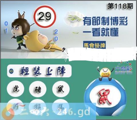 2025118期118期正版彩图挂:29 爆:鼠 挂牌成语:轻装上阵 挂牌出肖:虎猪鼠鸡猴马