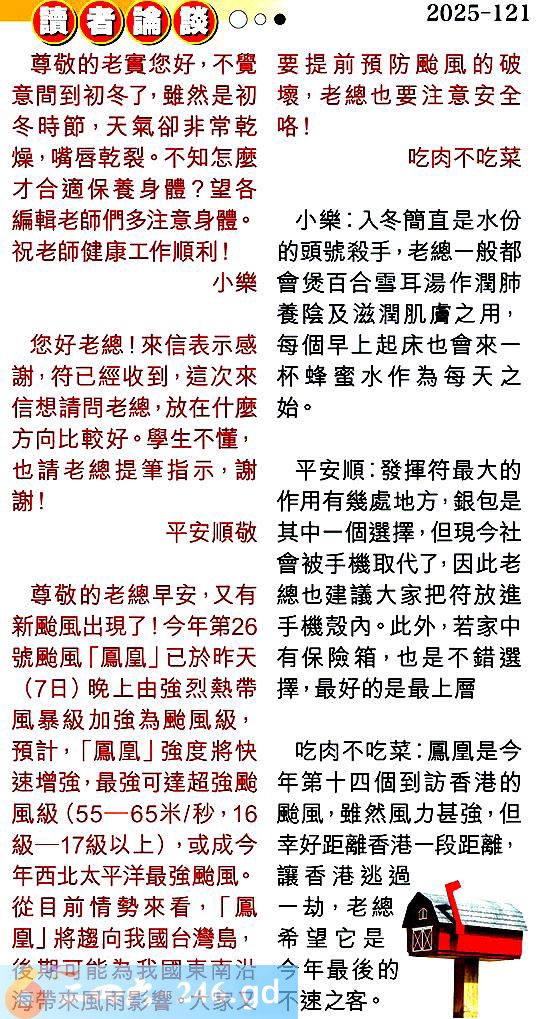 第一二一期讀者論談 1.尊敬的老實您好,不覺意間到初冬了,雖然是初冬時節,天氣卻非常乾燥,嘴唇乾裂。不知怎麼才合適保養身體?望各編輯老師們多注意身體。祝老師健康工作順利!小樂 〖小樂〗:入冬簡直是水份的頭號殺手,老總一般都會煲百合雪耳湯作潤肺養陰及滋潤肌膚之用,每個早上起床也會來一杯蜂蜜水作為每天之始。 2.您好老總!來信表示感謝,符已經收到,這次來信想請問老總,放在什麼方向比較好。學生不懂,也請老總提筆指示,謝謝!平安順敬 〖平安順〗:發揮符最大的作用有幾處地方,銀包是其中一個選擇,但現今社會被手機取代了,因此老總也建議大家把符放進手機殼內。此外,若家中有保險箱,也是不錯選擇,最好的是最上層 3.尊敬的老總早安,又有新颱風出現了!今年第26號飈風「鳳凰」已於昨天(7日)晚上由強烈熱帶風暴級加強為颱風級預計,「鳳凰」強度將快速增強,最強可達超強颱風級(55一65米/秒,16級一17級以上),或成今年西北太平洋最強颱風。從目前情勢來看,「鳳凰」將趨向我國台灣島,後期可能為我國東南沿海帶來風雨影響。大家又要提前預防颱風的破壞,老總也要注意安全咯!吃肉不吃菜 〖吃肉不吃菜〗:鳳凰是今年第十四個到訪香港的颱風,雖然風力甚強,但幸好距離香港段距離,讓香港逃過一劫,老總希望它是今年最後的不速之客。