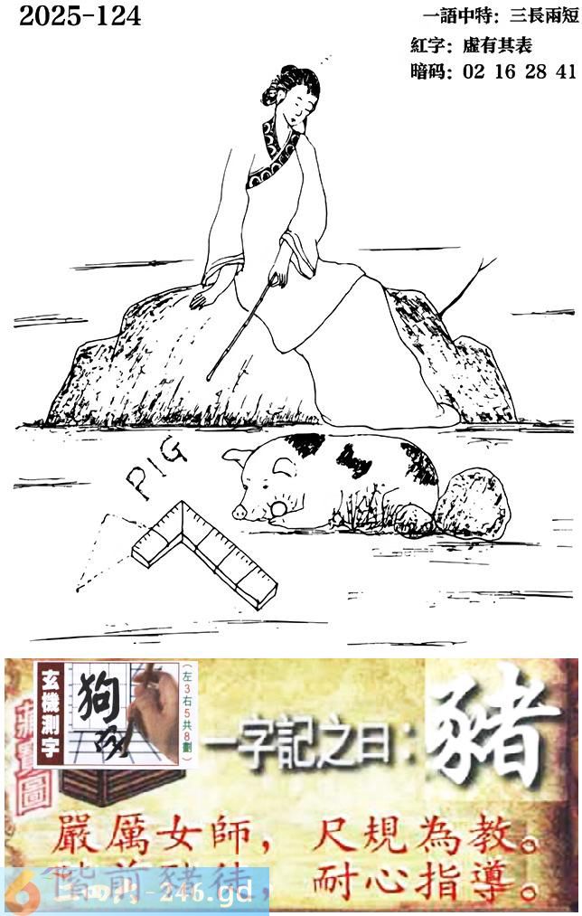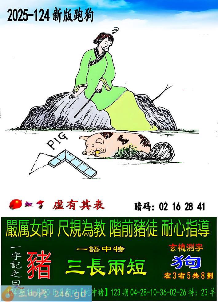 124期跑狗一字記之曰:【豬】 嚴厲女師,尺規為教。 階前豬徒,耐心指導。 玄機測字:《狗》 一語中特:三長兩短