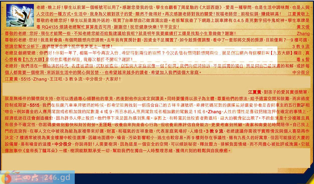 第131期《六合皇信箱文字版》10000%正確!!!正版二四六論壇*精心製作!!! 江夏黃、5515、、王汪旺、3教9流、中分很分,大家好! 【1】.老總,晚上好!學生以前第一個帳號可以用了。感謝您登我的信,學生也觀看了周星馳的《大話西遊》,爱是一種學問,也是生活中調味劑,也是人與人交往的一種方式。生活中,我身為父親對孩子的愛,顯然不做得好。再次感謝老師對我的關愛!祝福老師您:前程似錦,賺錢缽滿!江夏黄敬上 〖江夏黃〗:對孩子的愛其實很簡單,就是無條件的關懷與支持,你可以透過專心傾聽他的意見,然後對他作出肯定與讃美。同時要懂得以孩子為主體,尊重他們的想法,給予適當空間和鼓勵,而非過度控制或期望。 【2】.尊敬的老總您好!學生以前是跑外送的,現買了台車想自己做滴滴出遊。老爸幫我查了下網路上說車牌有0.4.5是兕數字招牛鬼蛇神。學生車牌是粤4135煩請老總幫忙算算是否可用,謝謝您!祝您健康快樂!平平安安!黃文俊 〖5515〗:我們在挑選汽車車牌號碼的時候,都希望能夠找到一個適合自己的吉祥幸運號碼,車牌號礪尾數的選擇最好還要參看是否與車主的五行數字相吻合。例如喜金的人應用尾數或者相加數的尾數是4或9,而喜水的人應用尾數或者相加數的尾數是1或6。 【3】.尊敬的老總:您好,現在才能閒一些,不知老總您能否給點建議給我呢?就是明年我要繼續打工還是找點小生意做做?謝謝! 〖〗:人性的慣性是喜歡把賭注押在確定的事情上,經濟低迷往往會創造機會,因為許多人停止投資。他們停下來是因為感到焦慮。事實上,有時當其他投資者撤退時,最大的機會就出現了。不過創業是十分複雜且具有很多不確定性,你起碼要做到勤快和刻苦耐勞。 【4】.尊敬的老總,您好!我是新會員,有個問題想向您請教。去年我有買房計劃,因資金不足擱置了,如今趁房價調整,看中了一套即將交房的房源,目前僅剩7一9樓可選,想請您幫忙分析下,選哪層更合適?祝您事業更上一層樓!3教9流 〖3教9流〗:老總建議你需視乎實際情況與個人喜惡再作決定,7樓通常被視為黃金樓層中較佳選擇,因離地面適中,噪音、污染影響較小,逃生也較容易。而9樓則存在爭議性,雖有九長久的好寓意,但因可能接近大廈的設備層,易有噪音的滋擾。 【5】.老總及創網管總:你們好!停彩一年了,相隔一年今再次入會,希望得到兩位的關照?今次去信有個問題想問兩位,就是創富網內有個欄目叫【九方大師】欄目,真心想看看【九方大師】是個什麼樣的欄目我每次都打不開呢?謝謝!粤智 〖王汪旺〗:收養自來狗是善心行為,但收養前應評估自身能力,更要考慮到照顧、清潔和需要花時間陪伴。自己找上門的流浪狗,在華人文化中被視為能為家裡帶來好運、財富、和福氣的吉祥象徵,代表家庭氣場好、人緣佳。 【6】.老總好,我們活在一個鼎沸的時代,表達被讃頌,沉默被遺忘,創富網大家庭就像一個「樹洞」我們向樹洞傾訴,不是孤獨的獨白,而是與自己最深處的和解,或許每個人都需要一個樹洞,來訴說生活中的開心與苦楚,,也希望越來越多的讀者,希望加入我們這個大家庭。中分很分 〖中分很分〗:你說得對!人需要樹洞,因為這是一個安全的空間,可以傾訴秘密、釋放壓力、排解負面情緒,而不用擔心被批評或洩漏。它就像故事中《皇帝長了驢耳朵》一樣,樹洞能默默承受一切,幫助我們在獨自一人時整理思緒,獲得片刻的輕鬆與自我療癒。 紅字:獨辟蹊徑 暗码:14263141 [释义]自己开辟一条路。比喻独创一种风格或新的方法。 [出处]清·叶燮《原诗·外篇上》:“抹倒体裁,声调、气象、格力诸说,独辟蹊径。”