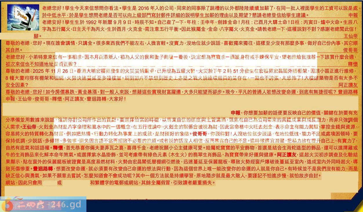 第132期《六合皇信箱文字版》10000%正確!!!正版二四六論壇*精心製作!!! 申報、王仙帝、俊哥哥、釋懷、阿正讀友、豐迴路轉,大家好! 【1】.老總您好!學生今天來信想問你看法。學生是2016年入的公司,同來的同事除了跳槽的以外都陸陸續續加薪了,在同一批人裡面學生的工資可以說是處於中低水平,於是學生想問老總是查可以向上級部門寫封郵件詳細的說明學生加薪的理由以及期望?請老總登信給學生建議。申報 〖申報〗:你想要加薪的話便要反映自己的價值,關鍵在於要有充分準備並用數據來說話,強調你對公司所作出的贡獻。要選擇怡當的時機,以專業自信的態度與主管溝通,聚焦在自己為公司帶來的具體成果與成長潛力,而非只強調個人需求。 【2】.老總安好!學生生於1992年新曆9月9日,時辰不知。自己查了一下,年柱:王申年,劍鋒金命!月柱:己酉月大驛土命!日柱:丙寅日,爐中火命。生辰八字為五行屬火,日主天干為丙火,生於酉月,火克金,需注意五行平衡因此猴屬金,金命八字屬火,火克金請教老總一下,這種說對不對?感謝老總閱此信!紅字:頭癢撓腳。王仙帝 〖王仙帝〗:火剋金為財是八字命理和風水中的一個概念,在五行理論中,火剋金的關係會被視為財,因此當命格中火旺去剋金,表示命主有能力駕馭、掌控金錢與資源,容易將火的特質轉化為財富,例如把熱情、行動力轉化為事業上的成就,是財運好的象徵。 【3】.尊敬的老總,您好。現在誰會講情,只講金。很多東西我們不能左右,人微言輕。沒實力,沒地位就少說話,喜歡獨來獨往,這樣至少沒有那麼多事,做好自己份內事,其它順其自然。俊哥哥 〖俊哥哥〗:你說得對!人沒地位就少說話,在地位低微、能力不足或處境困頓時,要保持低調,少說話,多傾聽、多做事避免因言語不當而招致不必要的麻煩。或者說的話沒人相信,反而暴露自己的不足。這時候適宜潛藏,把精力放在提升自己上,有實力了,自然有底氣和話語權。 【4】.老總您好,小弟特意來信有一事相求因本月喜添新人,初為人父的我和妻子商量一番後,決定想為寶寶求道護身符或手練保平安,望老總給我推荐一下該買什麼合適,初次來信也不知道地址是否正確?釋懷 〖釋懷〗:首先恭喜你倆夫妻弄瓦之喜,喜得千金,老總祝願小公主健康可爱。給屬蛇寶寶的平安飾物,首選是結合生肖蛇造型的飾品,還可以選擇雞或牛的生肖飾品來化解本命年煞氣。或選擇紫水晶掛飾,並可考慮帶有緣色元素(木生火)的翡翠生肖飾品,為寶寶帶來好運與健康。 【5】.尊敬的老總:2025年11月26日,香港大埔宏福苑發生的火炎災情嚴重,已升級為五級火警,火災於下午2時51分發生在宏福苑宏昌閣外牆棚架,因該小區正進行維修,8幢大廈均搭有棚架和棚網,火勢快速蔓延至多幢樓層。刷到影片不禁想到歷史上赤壁之戰火燒連環船真的是存在,一點也不誇張,太恐怖了!大樓建築物是否有太多不安全因素?阿正讀友 〖阿正讀友〗:這起火災初步調查及化驗結果顯示,貼在窗外的保麗龍板被證實是高度易燃材料,火勢由宏昌閣低層棚網引燃後,迅速蔓延至保麗龍板,導致火勢經窗户爆破後蔓延至室內,造成室內外同時起火,導致死傷慘重。 【6】.尊敬的老總,您好!如今房價暴跌、黃金暴漲,對一般人來說,想藉這些實現財富躍遷,大多只能望而卻步。現今,平凡的普通人若想改變命運,到底有無捷徑呢?豐迴路轉 〖豐迴路轉〗:想要改變命運,就必須要有改變自己命運的想法與行動,因為這個世界上唯一能改變你的命運的人就是你自己。有時候並不是我們沒有能力,而是缺乏信心與勇氣,如果不願意去嘗試,怎麼知道會不會成功呢?其中一個方法就是持續學習,原地踏步就是最大敵人,要謹記不怕進步慢,就怕故步自封。 紅字:酒入愁腸 暗码:04262845 [释义]指忧愁的人饮酒容易喝醉。
