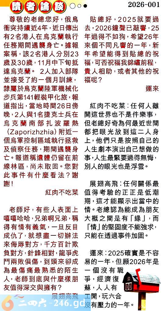 第001期讀者論談 1.尊敬的老總您好,俄烏衝突持續近4年,近日傳出有2名港人在烏克蘭執行任務期間遇襲身亡。據報案稱,該2名港人分別23歲及30歲,11月中下旬抵達烏克蘭。2人加入部隊並接受了約一個月訓練,隸屬於烏克蘭陸軍機械化步兵第141輕裝甲化旅,報道指出,當地時間26日傍晚,2人與1名捷克士兵在鳥克蘭南部扎波羅熱()附近一個烏軍控制區域執行拯救及偵察任務,期間遇襲身亡。報道稱遺體仍留在前線林區,尚未取回。您對此事件有什麼看法?謝謝!紅肉不吃菜 〖紅肉不吃菜〗:任何人離開這世界也不是件樂事,但老總好奇為何最近世間都把眼光放到這二人身上,他們只是按照自己的人生劇本演出自己想做的事,人生最緊要過得無悔,別人的眼光也是浮雲。 2.老師好,有些人表面上嘻嘻哈哈,兄弟啊兄弟,稱得有情有義氣,一旦反目成仇了,就想盡一切辦法來侮辱對方,千方百計欺負對方,針鋒相對,龍爭虎鬥兩敗俱傷,到頭來卻成為最傷痛最熟悉的陌生人,老師到底與什麼樣朋友值得深交與擁有?展翅高飛 〖展翅高飛〗:任何關係最值得考驗的正正是低潮期,這才能顯示出當中的情。老總認為能成為朋友大概之間是有「緣」,而「情」的堅固度不能強求,只能在透過事件加固。 3.貼總好,2025就要過去,2026鐘聲已敲響,25年過得不如狗,希望26年來個不同凡響的一年,新年希望能得到貼總的祝福,可否祝福我錦繡前程,貴人相助,或者其他的祝福呢?運來 〖運來〗:2025確實是不容易的一年,但願2026年是一個沒有戰爭,經濟復蘇,人人有工開,玩六合沒有壓力的一年。
