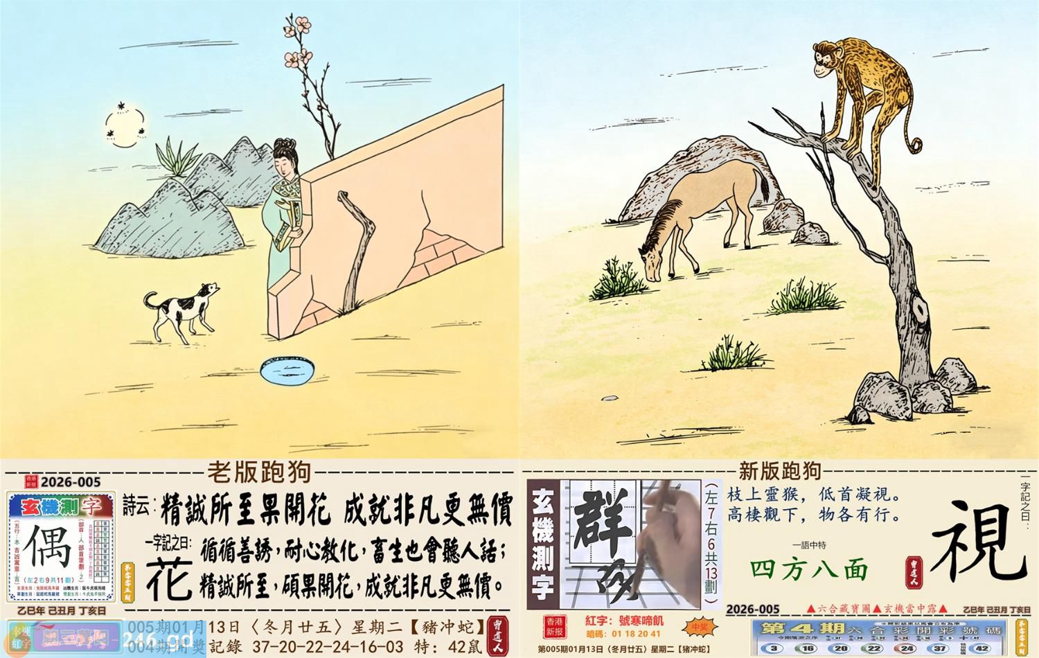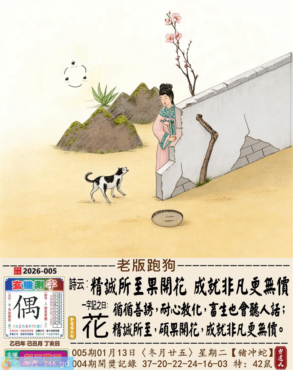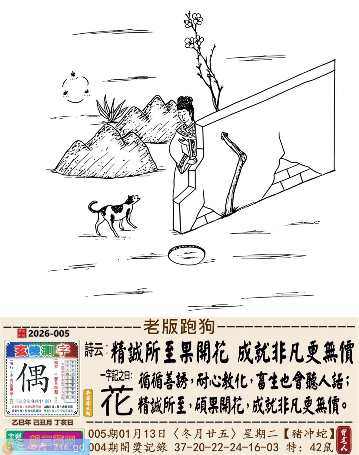 2026年1月13日005期蛇(辛巳)(屋上土) 005期:老版跑狗玄機一字記之曰:【花】 詩云:精誠所至果開花成就非凡更無價 循循善誘,耐心教化,畜生也會聽人話; 精誠所至,碩果開花,成就非凡更無價。 玄機測字:《偶》 密圖詩:打開大門迎財神 《記》:八仙過海顯蛇兔 特碼大小單雙句:天涯海角 今期必中:劉協 005期:特碼歇后語 砍了头的竹子-----节外生枝 005期正版四字梅花诗:春秋战国。 005期火车头:烧伤鸡。诗:龙死猪伤,三八连理必二十。 005期香港第一手欲钱料:金? 005期曾道人说:“四?” 005期另版四字梅花诗:马会天子。 005期香港第一手欲钱料:欲钱看大家身边最亲近的动物。 005期曾道人说:“女人三十后为什么上厕所不关门”? 005期:二字經:京城 005期:电灯是特码 005期:智力金壤;飞蛾扑火 005期:信箱紅字:【號寒啼飢】 005期:【暗碼:01-18-20-41】 005期:一語中特:【四方八面】 發財玄機圖:毛皮雪白墨守成規圖中明兔紅綠 005期:藏寳圖 新:倚阁尘消玉树空 老:郑虔自笑穷耽酒 禁:蛇禁:8尾玄機字《滋》 2026年005期【生活幽默】版 〖乞討〗 一個乞丐來到一個吝嗇鬼家門前乞討。乞丐:"請給一小塊肥肉,乳酪或奶油。" 吝嗇鬼:"没有呀!"乞丐:"面包屑也行。"吝嗇鬼:"也没有。" 乞丐:"那就给口水喝吧!" 吝嗇鬼:"我們連水也没有了。" 乞丐發怒了:"那你爲什還坐在家裏?快跟我一起要飯去!"