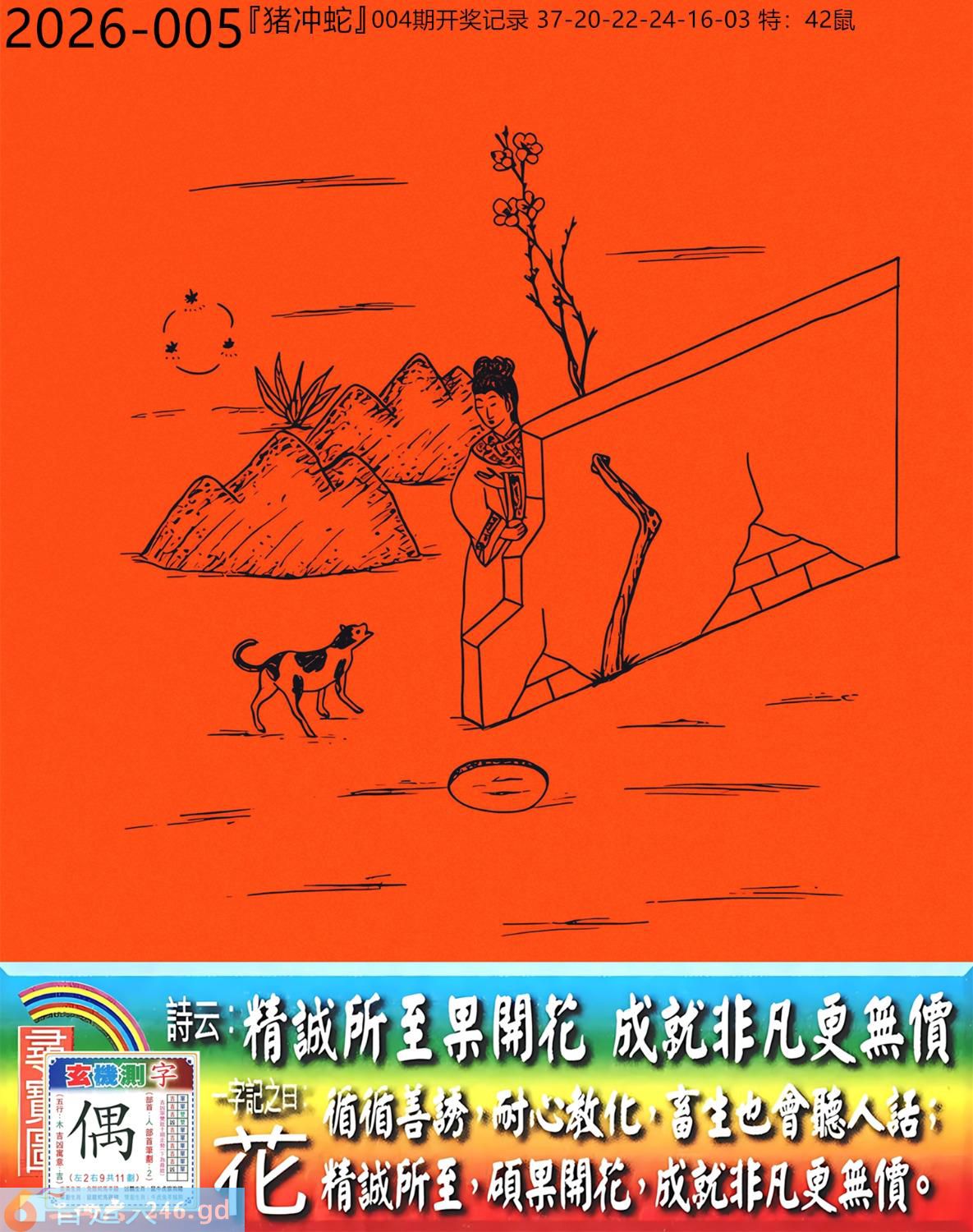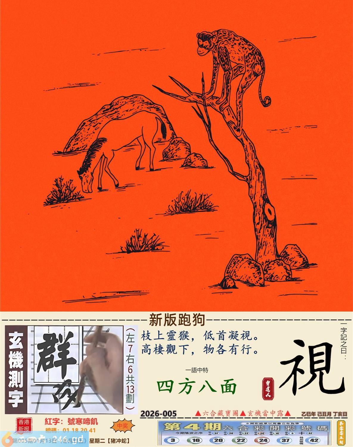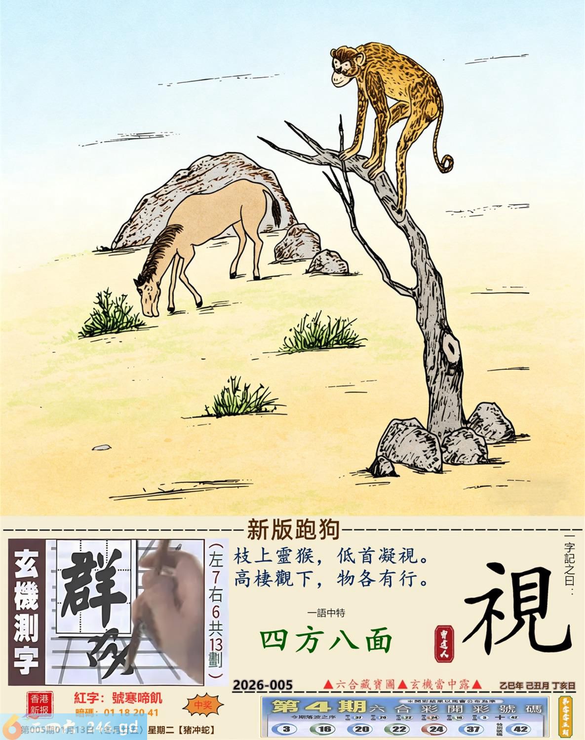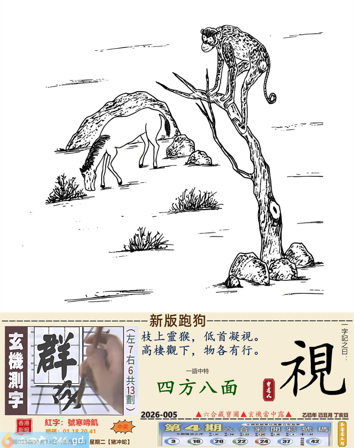2026年1月13日005期蛇(辛巳)(屋上土) 005期:老版跑狗玄機一字記之曰:【花】 詩云:精誠所至果開花成就非凡更無價 循循善誘,耐心教化,畜生也會聽人話; 精誠所至,碩果開花,成就非凡更無價。 玄機測字:《偶》 密圖詩:打開大門迎財神 《記》:八仙過海顯蛇兔 特碼大小單雙句:天涯海角 今期必中:劉協 005期:特碼歇后語 砍了头的竹子-----节外生枝 005期正版四字梅花诗:春秋战国。 005期火车头:烧伤鸡。诗:龙死猪伤,三八连理必二十。 005期香港第一手欲钱料:金? 005期曾道人说:“四?” 005期另版四字梅花诗:马会天子。 005期香港第一手欲钱料:欲钱看大家身边最亲近的动物。 005期曾道人说:“女人三十后为什么上厕所不关门”? 005期:二字經:京城 005期:电灯是特码 005期:智力金壤;飞蛾扑火 005期:信箱紅字:【號寒啼飢】 005期:【暗碼:01-18-20-41】 005期:一語中特:【四方八面】 發財玄機圖:毛皮雪白墨守成規圖中明兔紅綠 005期:藏寳圖 新:倚阁尘消玉树空 老:郑虔自笑穷耽酒 禁:蛇禁:8尾玄機字《滋》 2026年005期【生活幽默】版 〖乞討〗 一個乞丐來到一個吝嗇鬼家門前乞討。乞丐:"請給一小塊肥肉,乳酪或奶油。" 吝嗇鬼:"没有呀!"乞丐:"面包屑也行。"吝嗇鬼:"也没有。" 乞丐:"那就给口水喝吧!" 吝嗇鬼:"我們連水也没有了。" 乞丐發怒了:"那你爲什還坐在家裏?快跟我一起要飯去!"