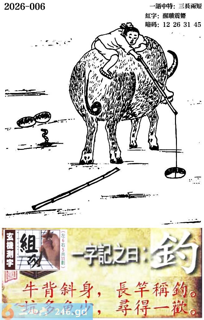 006期跑狗一字記之曰:【釣】 牛背斜身,長竿稱釣。 坑多魚少,尋得壹歡。 玄機測字:《組》 一語中特:三長兩短