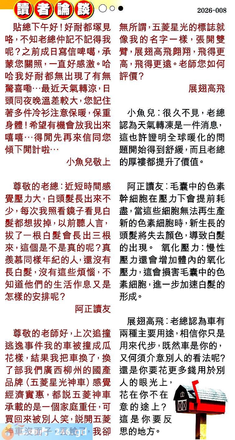 第008期讀者論談 1.貼總下午好!好耐都塚見咯,不知老總仲記不記得我呢?之前成日寫信啤噶,承蒙您關照,一直好感激。哈哈我好耐都無出現了有無驚喜嘞...最近天氣轉涼,日頭同夜晚溫差較大,您記住著多件冷衫注意保暖,保重身體!希望有機會放我出來嘻嘻...得閒先再來信同您傾下聞計啦...小魚兒敬上 〖小魚兒〗:很久不見,老總認為天氣轉凍是一件消息,這也許證明全球暖化的問題開始得到舒緩,而且老總的厚褸都提升了價值 2.尊敬的老總:近短時間感覺壓力大,白頭髪長出來不少,每次我照看鏡子看見白髪都想拔掉,以前聽大言,拔了一根白髪會長出三根來,這個是不是真的呢?真羡慕同樣年紀的人,還沒有長白髪,沒有這些煩惱,不知道他們的生活作息又是怎樣的安排呢?阿正讀友 〖阿正讀友〗:毛囊中的色素幹細胞在壓力下會提前耗盡,當這些細胞無法再生產新的色素細胞時,新生長的頭髮將失去顔色,導致白髪的出現。氧化壓力:慢性壓力還會增加體內的氧化壓力,這會損害毛囊中的色素細胞,進一步加速白髪的形成。 3.尊敬的老師好,上次追撞逃逸事件我的車被撞成瓜花樣,結果我把車換了,換了部我們廣西柳州的國產品牌(五菱星光神車)感覺經濟實惠,都説五菱神車承載的是一個家庭重任,可買回來被别人笑,説開五菱神車沒面子,丢臉了,我卻無所謂,五菱星光的標誌就像我的名字一樣,張開雙臂,展翅高飛翱翔,飛得更高,飛得更遠。老師您如何評價?展翅高飛 〖展翅高飛〗:老總認為車有兩種主要用途,相信你只是用來代步,既然車是你的,又何須介意别人的看法呢?還是你要花更多錢用於別人的眼光上,花在你不在意的途上?這是你要反思的地方。