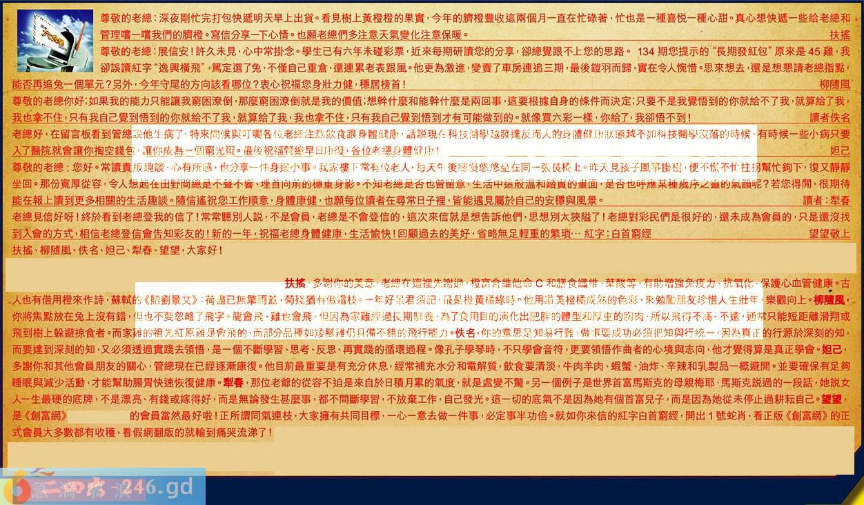 第011期《六合皇信箱文字版》10000%正確!!!正版二四六論壇*精心製作!!! 扶搖、柳隨風、佚名、妲己、犁春、望望,大家好! 【1】.尊敬的老總:深夜剛忙完打包快遞明天早上出貨。看見樹上黄橙橙的果實,今年的臍橙豐收這兩個月一直在忙碌著,忙也是一種喜悦一種心甜。真心想快遞一些給老總和管理嚐一嚐我們的臍橙。寫信分享一下心情。也願老總們多注意天氣變化注意保暖。扶摇 〖扶摇〗:多谢你的美意,老總在這裡先謝過,橙高含維他命和膳食繊維、葉酸等,有助增強免疫力、抗氧化、保護心血管健康。古人也有借用橙來作詩,蘇軾的《赠到录文》:荷强已無擎雨蓋,菊殘猫有傲霜枝。一年好景君須記,最是橙黄橘緣時。他用識美橙橘成熟的色彩,來勉勵朋友珍惜人生壮年,樂觀向上。 【2】.尊敬的老總:展信安!許久未見,心中常掛念。學生已有六年未碰彩票,近來每期研讀您的分享,卻總覺跟不上您的思路。134期您提示的“長期發紅包”原來是45難,我卻誤讀紅字“逸興横飛”,篤定選了兔,不僅自己重倉,逻連累老表跟風。他更為激進,變賣了車房連追三期,最後鎧羽而歸,實在令人惋惜。思來想去,還是想懇請老總指點,能否再追兔一個單元?另外,今年守尾的方向該看哪位?衷心祝福您身壯力健,穩居榜首!柳隨風 〖柳隨風〗:你將焦點放在免上沒有錯,但也不要忽略了飛字。龍會飛、難也會飛,但因為家雖經過長期馴養,為了食用目的演化出肥胖的體型和厚重的胸肉,所以飛得不高、不遠,通常只能短距離滑翔或飛到樹上躲避掠食者。而家難的祖先紅原難是會飛的,而部分品種如矮腳雅仍具備不錯的飛行能力。 【3】.尊敬的老總你好;如果我的能力只能讓我窮困潦倒,那麼窮困潦倒就是我的價值;想幹什麼和能幹什麼是兩回事,這要根據自身的條件而決定;只要不是我覺悟到的你就給不了我,就算給了我,我也拿不住,只有我自己覺到悟到的你就給不了我,就算給了我,我也拿不住,只有我自己覺到悟到才有可能做到的。就像買六彩一樣,你給了,我卻悟不到!讀者佚名 〖佚名〗:你的意思是知易行難,做事要成功必須把知與行统一,因為真正的行源於深刻的知,而要達到深刻的知,又必須透過實踐去領悟,是一個不斷學習、思考、反思、再實践的循環過程。像孔子學琴時,不只學會音符,更要領悟作曲者的心境與志向,他才覺得算是真正學會。 【4】.老總好,在留言板看到管總説他生病了,特來問候與叮囑各位老總注意飲食跟身體健康,話説現在科技醫學越發達反而人的身體健康狀態越不如科技醫學沒落的時候,有時候一些小病只要入了醫院就會讓你掏空錢包,讓你成為一個第光蛋。最後祝福管總星日康復,各位老總身體健康!妲己 〖妲己〗:多謝你和其他會員朋友的關心,管總現在已經逐漸康復。他目前最重要是有充分休息,經常補充水分和電解質,飲食要清淡,牛肉羊肉、蝦蟹、油炸、辛辣和乳製品一概避開。並要確保有足夠睡眠與減少活動,才能幫助腸胃快速恢復健康。 【5】.尊敬的老總:您好。常讀貴版趣談,心有所感,也分享一件身邊小事。我家樓下常有位老人,每天午後總慢悠悠坐在同一張長椅上。昨天見孩子風筝掛樹,便不慌不忙拄拐幫忙鉤下,復又靜靜坐回。那份宽厚從容,令人想起在田野間總是不聲不響、埋首向前的穩重身影。不知老總是否也曾留意,生活中這般溫和踏實的畫面,是否也呼應某種歲序之靈的氣韻呢?若您得閒,很期待能在報上讀到更多相關的生活趣談。隨信遙祝您工作順意,身體康健,也願每位讀者在尋常日子裡,皆能遇見屬於自己的安穩與風景。讀者:犁春 〖犁春〗:那位老爺的從容不迫是來自於日積月累的氣度,就是處變不驚。另一個例子是世界首富馬斯克的母親梅耶·馬斯克説過的一段話,她説女人一生最硬的底牌,不是漂亮、有錢或嫁得好,而是無論發生甚麼事,都不間斷學習,不放棄工作,自己發光。這一切的底氣不是因為她有個首富兒子,而是因為她從未停止過耕耘自己。 【6】.老總見信好呀!終於看到老總登我的信了!常常聽别人説,不是會員,老總是不會登信的,這次來信就是想告訴他們,思想別太狭隘了!老總對彩民們是很好的,還未成為會員的,只是還沒找到入會的方式,相信老總登信會告知彩友的!新的一年,祝福老總身體健康,生活愉快!回顧過去的美好,省略無足輕重的繁琐...紅字:白首窮經望望敬上 〖望望〗:是《創富網》的會員當然最好啦!正所謂同氣連枝,大家擁有共同目標,一心一意去做一件事,必定事半功倍。就如你來信的紅字白首窮經,開出1號蛇肖,看正版《創富網》的正式會員大多數都有收穫,看假網翻版的就輸到痛哭流涕了! 紅字:急湍駛浪 暗码:05313946 [释义]指水流速度极快,且常伴有浪花飞溅的视觉特征。 [出处]晋代挚虞《观鱼赋》:“忽浪达於急湍”。