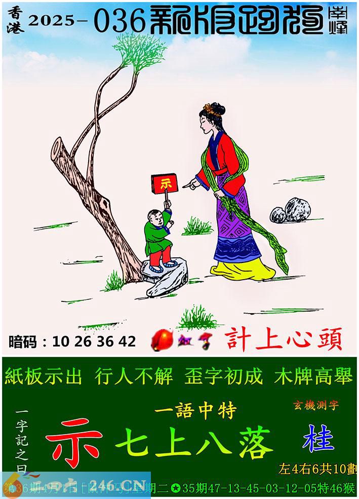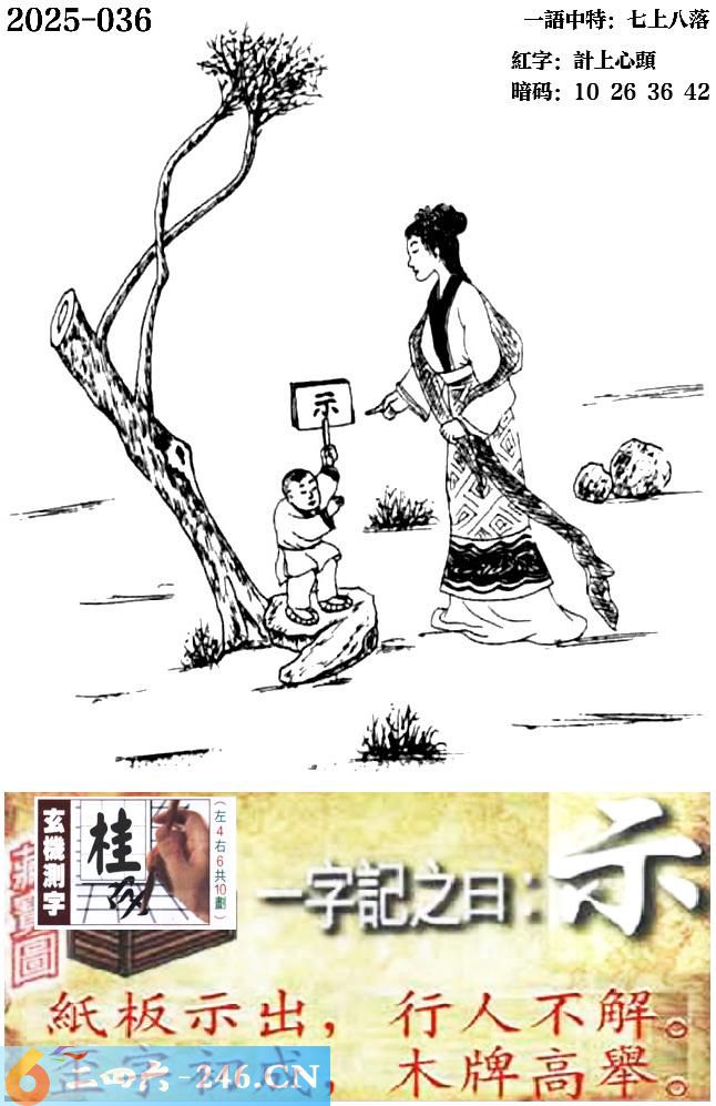 036期跑狗一字記之曰:【示】 紙板示出,行人不解。 歪字初成,木牌高舉。 玄機測字:《桂》 一語中特:七上八落