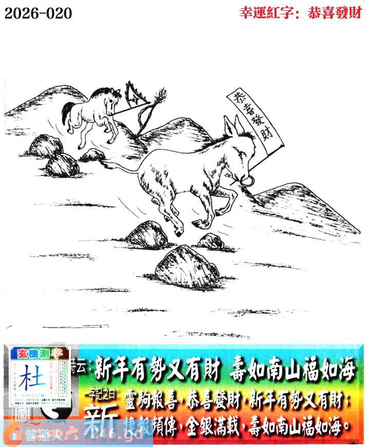 020期老版跑狗一字記之曰:【新】 詩雲:新年有勢又有財,壽如南山福如海。 靈駒報喜,恭喜發財,新年有勢又有財; 捷報頻傳,金銀滿載,壽如南山福如海。 玄機測字:《杜》