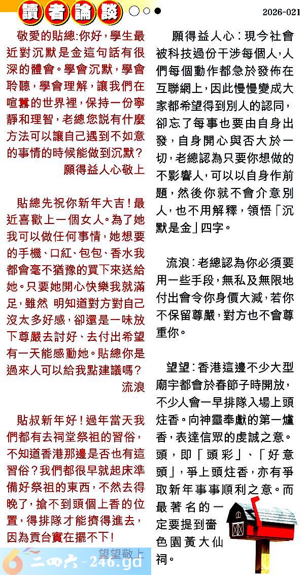 第021期讀者論談 1.敬愛的貼總:你好,學生最近對沉默是金這句話有很深的體會。學會沉默,學會聆聽,學會理解,讓我們在喧嚣的世界裡,保持一份寧靜和理智,老總您説有什麼方法可以讓自己遇到不如意的事情的時候能做到沉默?願得益人心敬上 〖願得益人心〗:現今社會被科技過份干涉每個人,人們每個動作都急於發佈在互聯網上,因此慢慢變成大家都希望得到别人的認同,卻忘了每事也要由自身出發,自身開心與否大於一切,老總認為只要你想做的不影響人,可以以自身作前題,然後你就不會介意別人,也不用解釋,領悟「沉默是金」四字。 2.貼總先祝你新年大吉!最近喜歡上一個女人。為了她我可以做任何事情,她想要的手機·口紅、包包、香水我都會毫不猶豫的買下來送給她。只要她開心快樂我就滿足,雖然明知道對方對自己沒太多好感,卻還是一味放下尊嚴去討好、去付出希望有一天能感動她。貼總你是過來人可以給我點建議嗎?流浪 〖流浪〗:老總認為你必須要用一些手段,無私及無限地付出會令你身價大減,若你不保留尊嚴,對方也不會尊重你。 3.貼叔新年好!過年當天我們都有去祠堂祭祖的習俗,不知道香港那邊是否也有這習俗?我們都很早就起床準備好祭祖的東西,不然去得晚了,搶不到頭個上香的位置,得排隊才能擠得進去,因為貢台實在擺不下!望望敬上 〖望望〗:香港這邊不少大型廟宇都會於春節子時開放,不少人會一早排隊入場上頭炷香。向神靈奉獻的第一爐香,表達信眾的虔誠之意。頭,即「頭彩」、「好意頭」,爭上頭炷香,亦有爭取新年事事順利之意。而最著名的一定要提到嗇色園黃大仙祠。