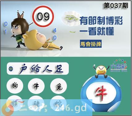 037期正版彩图挂:09 爆:牛 挂牌成语:戶給人足 挂牌出肖:狗牛兔猴猪蛇