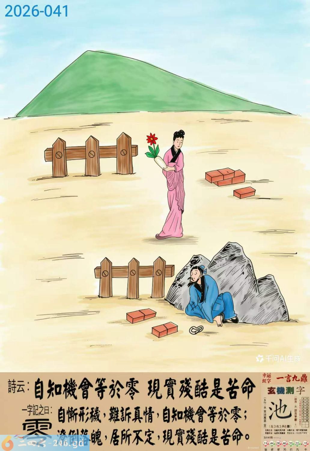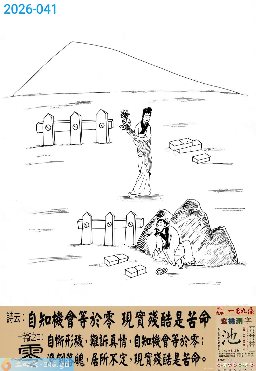 2026年4月16日二月廿九星期四石榴木猴日冲虎 041期:老版跑狗玄機一字記之曰:【零】 詩云:自知機會等於零,現實殘酷是苦命。 自慚形穢,難訴真情,自知機會等於零; 潦倒落魄,居所不定,現實殘酷是苦命。 玄機測字:《池》 密圖詩:山中無老虎 記:三門自有九尾數 特碼大小單雙句:抱着老婆暖被窩 今期必中:貂蟬 041期:特碼歇后語 李鬼劫路-----欺世盗名 041期正版四字梅花诗:三贞九烈。 041期火车头:烧伤猪。诗:鼠死龙伤,单二加九更出来。 041期香港第一手欲钱料:石头。 041期曾道人说:“三?” 041期另版四字梅花诗:狗年大吉。 041期香港第一手欲钱料:欲钱看珠海的边沿。 041期曾道人说:“为什么胖的女人喜欢减肥”? 041期:二字经:蓝红。 041期:一二四六有特码 041期:智力金壤:舉足輕重 發財玄機圖:忠心耿耿狀態活潑圖中明狗藍綠 041期信箱紅字:【善罷甘休】 041期【暗碼:05164849】 041期一語中特:【三頭六臂】 041期:藏寳圖 新:江南霜重莫嫌渠 老:青山朝别暮还见 禁:马禁:7尾玄機字《阁》 2026年041期【生活幽默】版 〖诈骗罪〗 美國一所法律學校,有一天考刑法。 教授向學生提出的第一個問題是:"什叫詐騙罪?" 一個學生回答説:"如果您不讓我考試及格則犯詐騙罪。" 教授非常詫异:"怎麽解釋?哪個學生能解答這個問題。" 一個學生説:"根據刑法,凡利用他人的無知而使其蒙受損失的人則犯詐騙罪。"