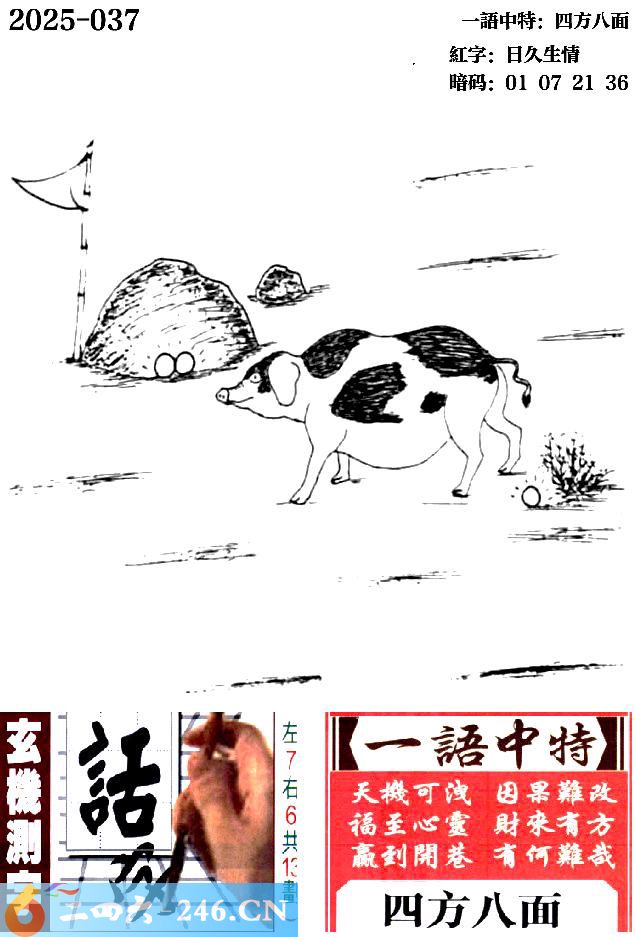 037期跑狗一字記之曰:【肥】 寻食戏草,肥猪漫步。 体态憨厚,悠闲渡日。 玄機測字:《話》 一語中特:四方八面
