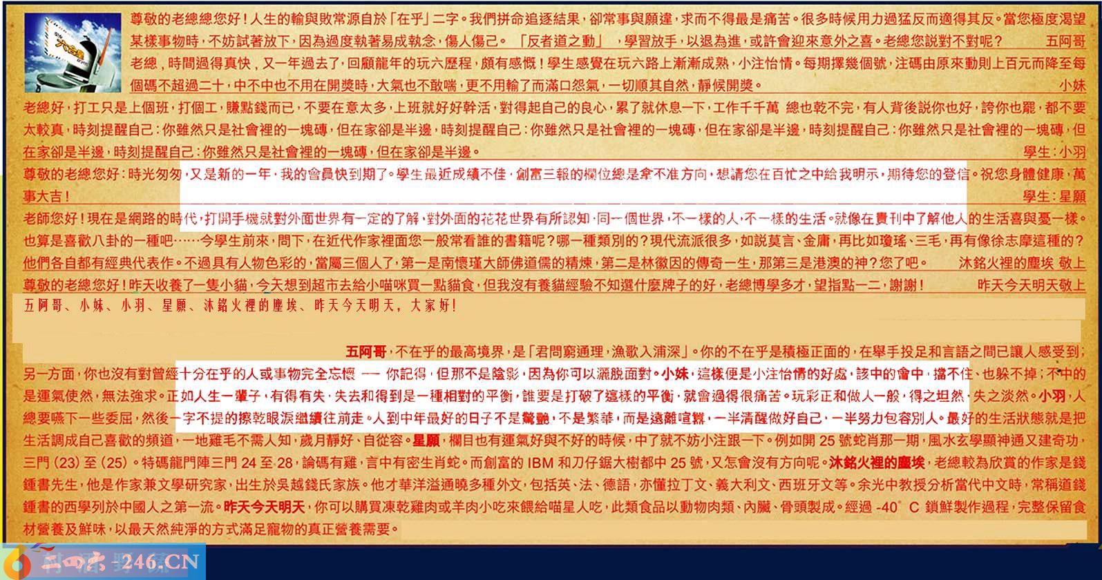 【4】.尊敬的老總您好:時光匆匆,又是新的一年.我的會員快到期了。學生最近成績不佳,創富三報的欄位總是拿不准方向,想請您在百忙之中給我明示,期待您的登信。祝您身體健康,萬事大吉!學生:星願