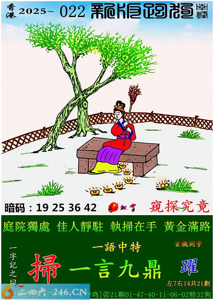 022期跑狗一字記之曰:【掃】 庭院獨處,佳人靜駐。 執掃在手,黃金滿路。