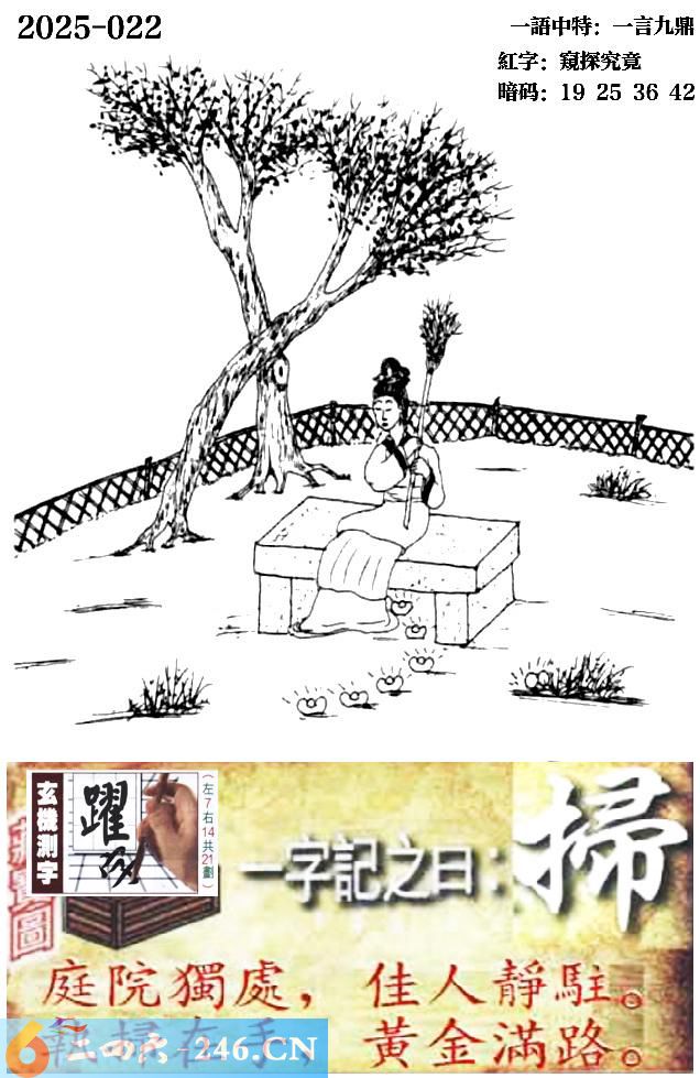 022期跑狗一字記之曰:【掃】 庭院獨處,佳人靜駐。 執掃在手,黃金滿路。 玄機測字:《躍》 一語中特:一言九鼎